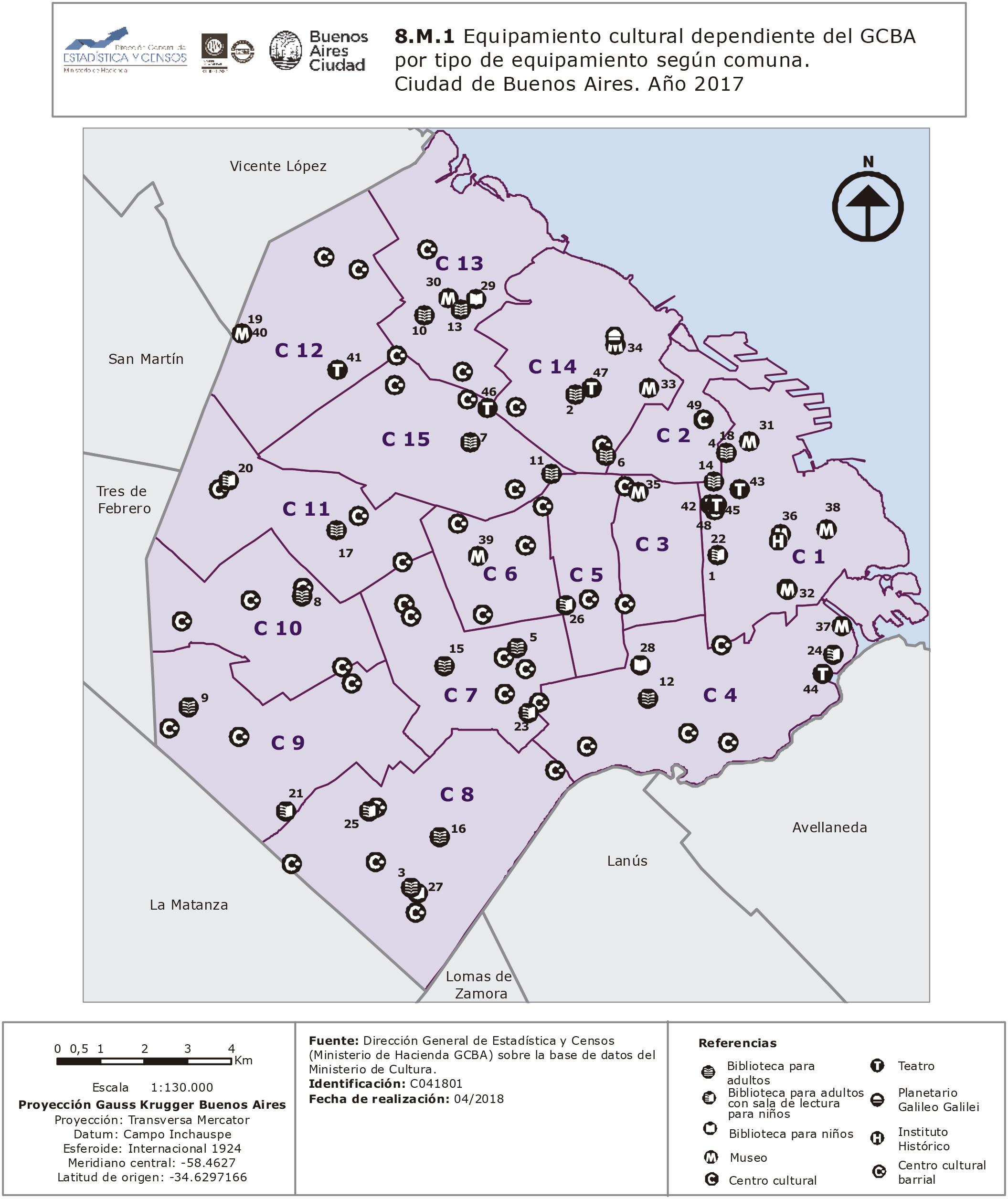 Equipamiento cultural dependiente del GCBA por tipo de equipamiento según comuna. Ciudad de Buenos Aires. Año 2017