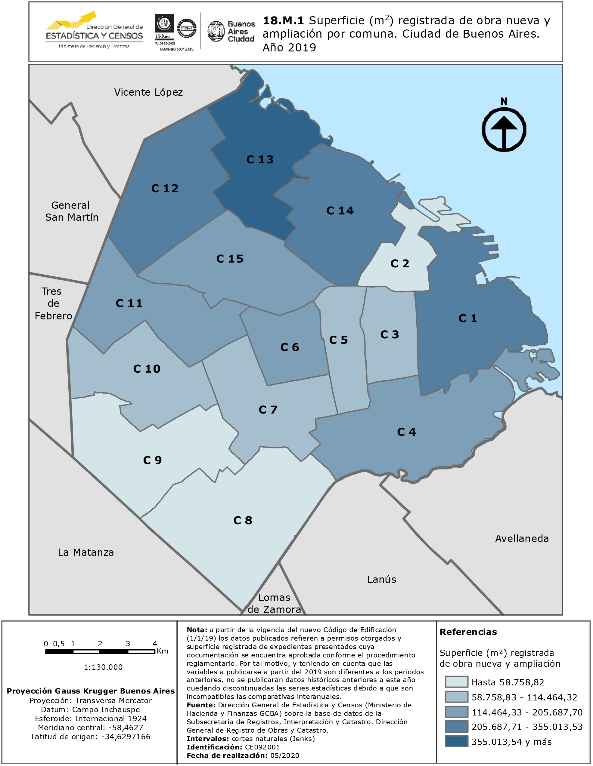 Superficie (m2) registrada de obra nueva y ampliación por comuna. Ciudad de Buenos Aires. Año 2019