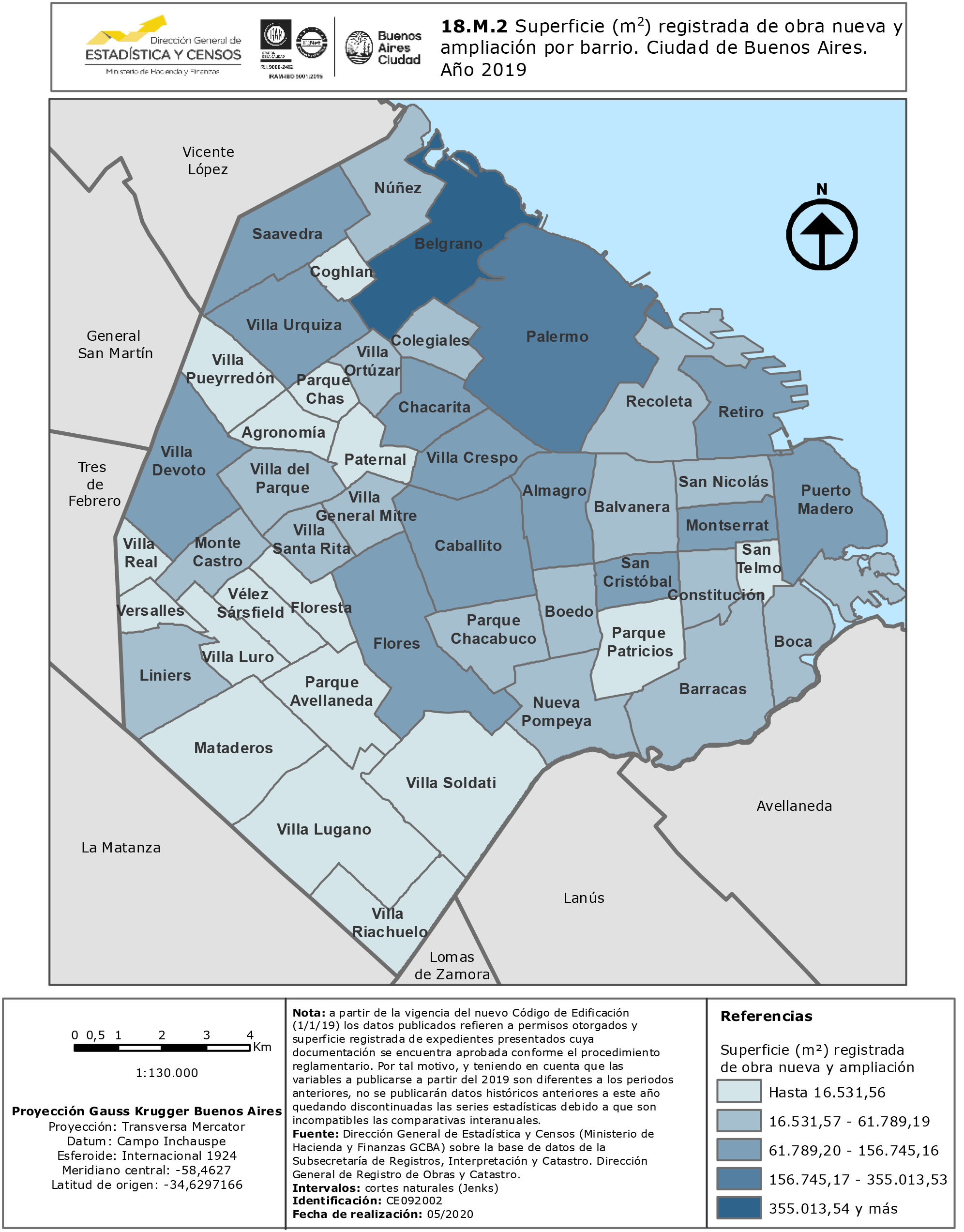 Superficie (m2) registrada de obra nueva y ampliación por barrio. Ciudad de Buenos Aires. Año 2019