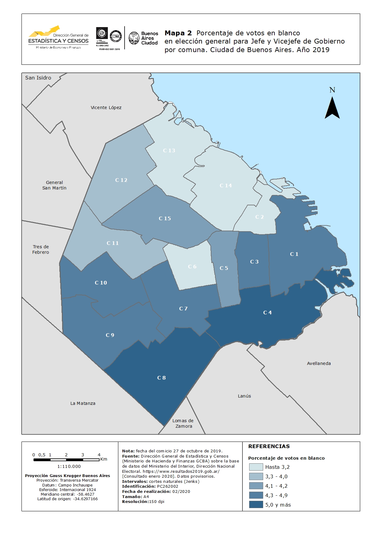 Porcentaje de votos en blanco en elección general para Jefe y Vicejefe de Gobierno por comuna. Ciudad de Buenos Aires. Año 2019