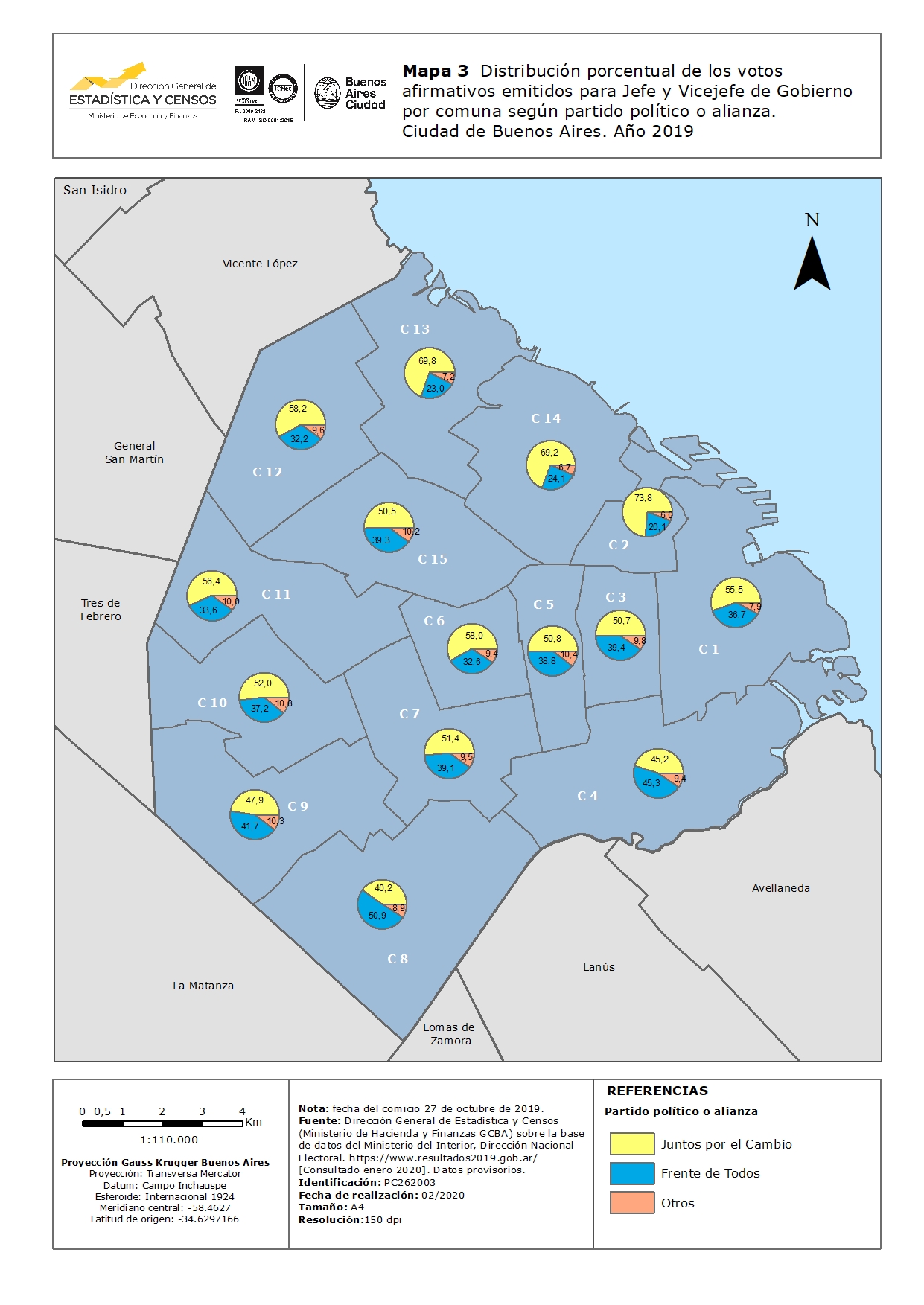 Distribución porcentual de los votos afirmativos emitidos para Jefe y Vicejefe de Gobierno por comuna según partido político o alianza.Año 2019