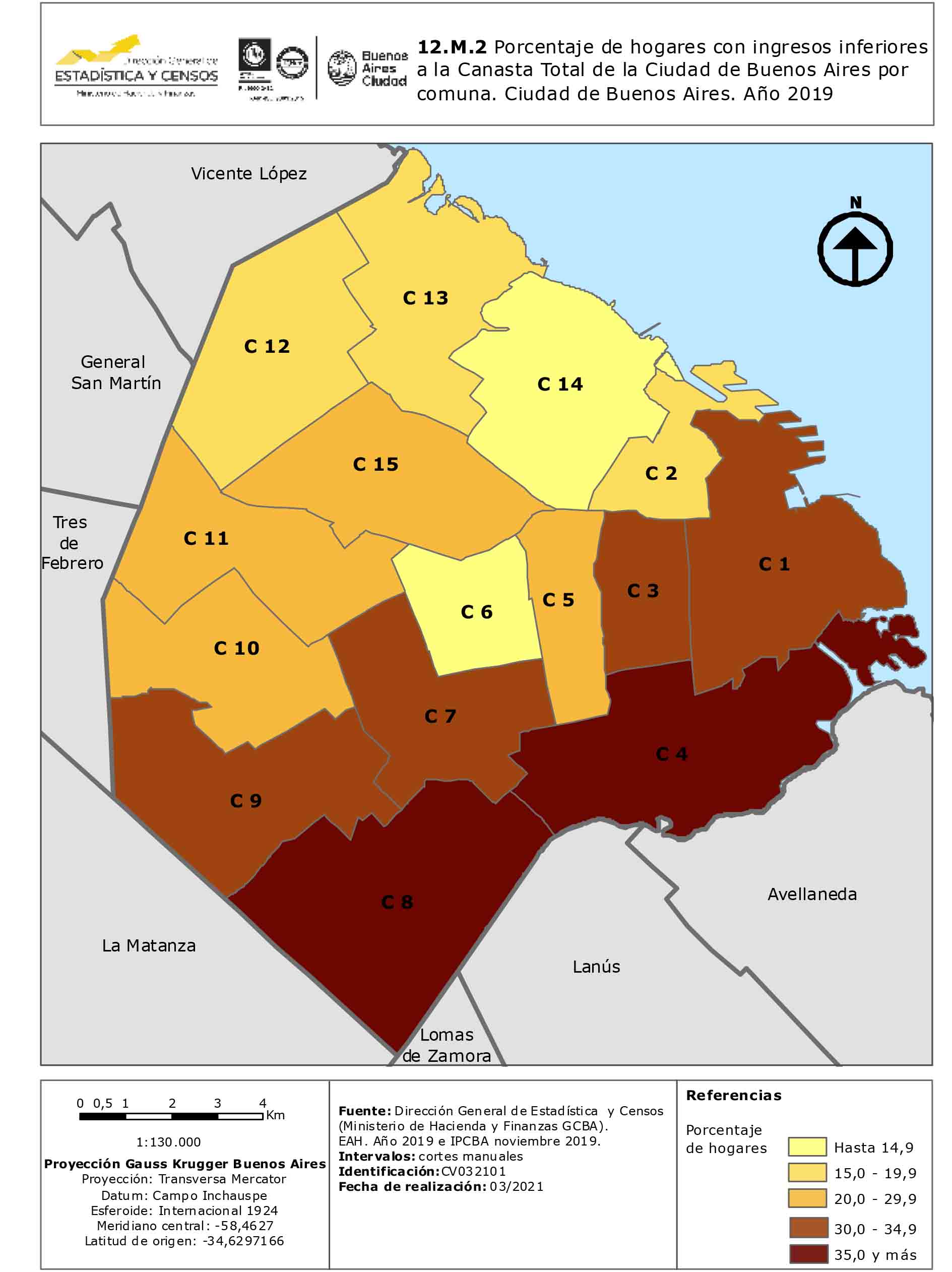 Porcentaje de hogares con ingresos inferiores a la Canasta Total de la Ciudad de Buenos Aires por comuna. Ciudad de Buenos Aires. Año 2019