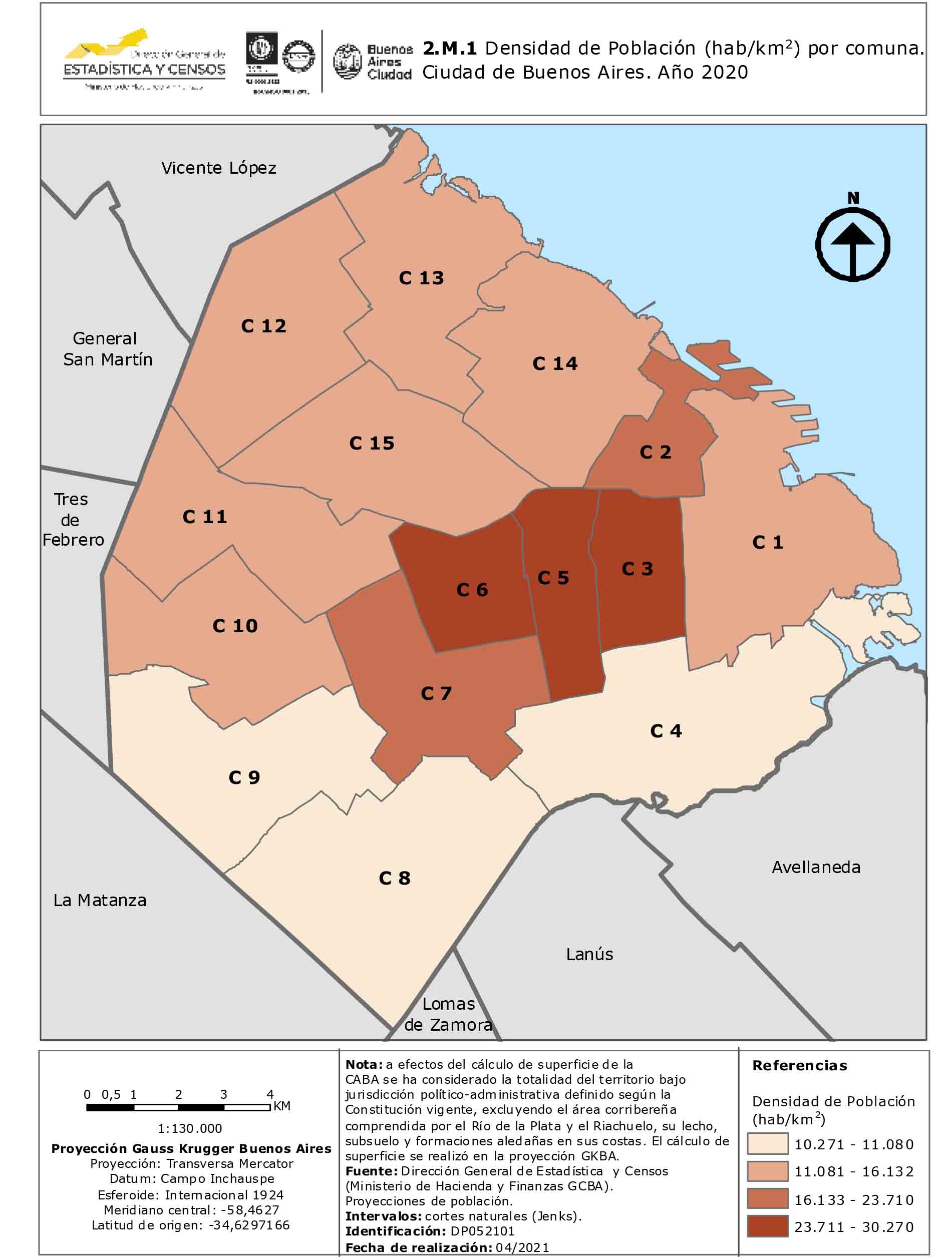 Densidad de Población (hab/km2) por comuna. Ciudad de Buenos Aires. Año 2020
