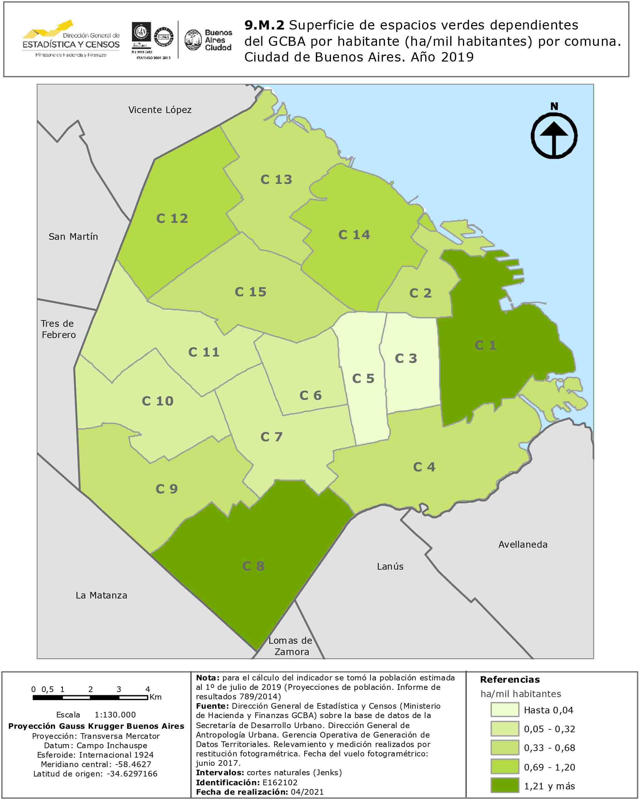 Superficie de espacios verdes dependientes del GCBA por habitante (ha/mil habitantes) por comuna. Ciudad de Buenos Aires. Año 2019