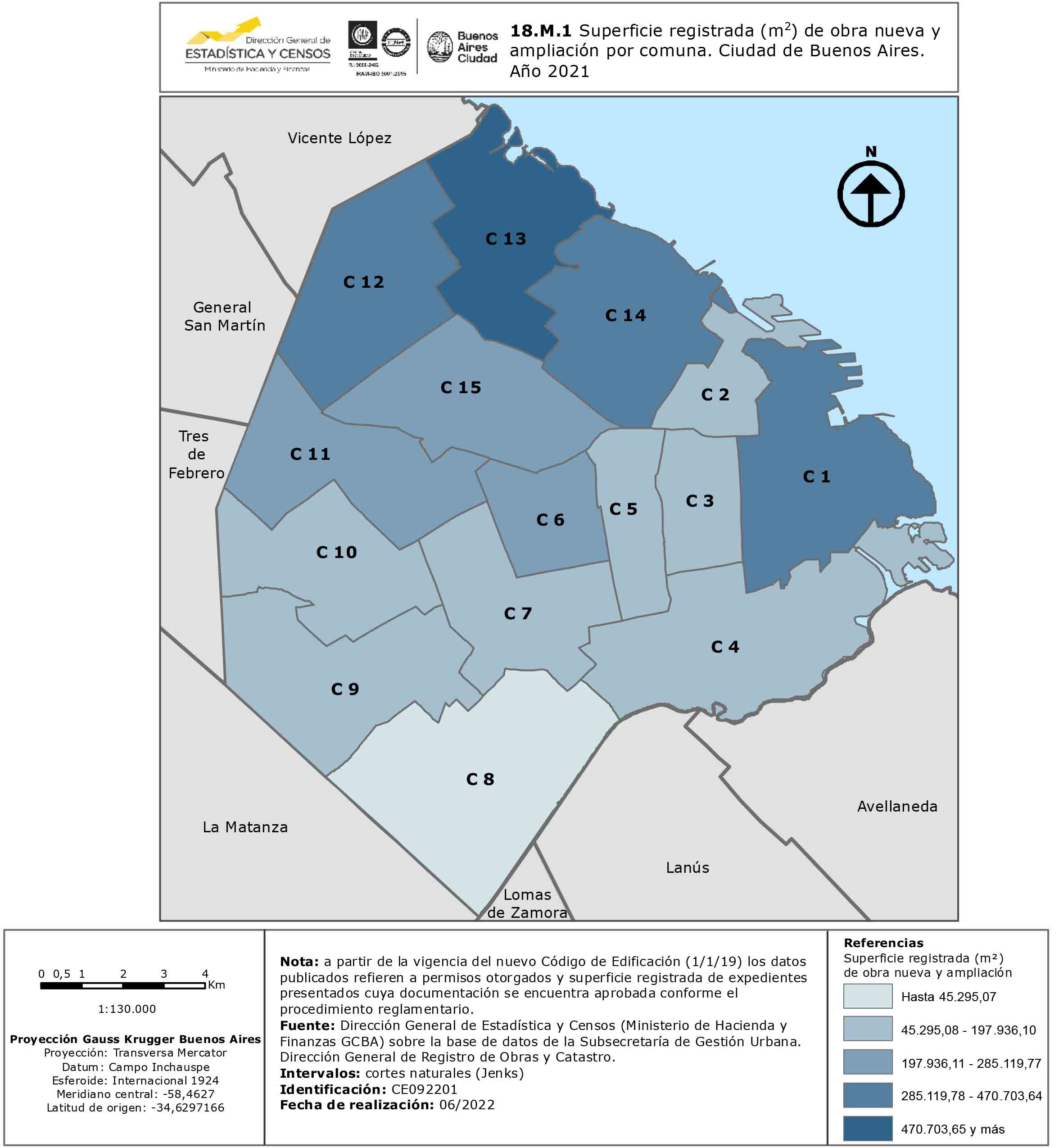 Superficie registrada (m2) de obra nueva y ampliación por comuna. Ciudad de Buenos Aires.Año 2021