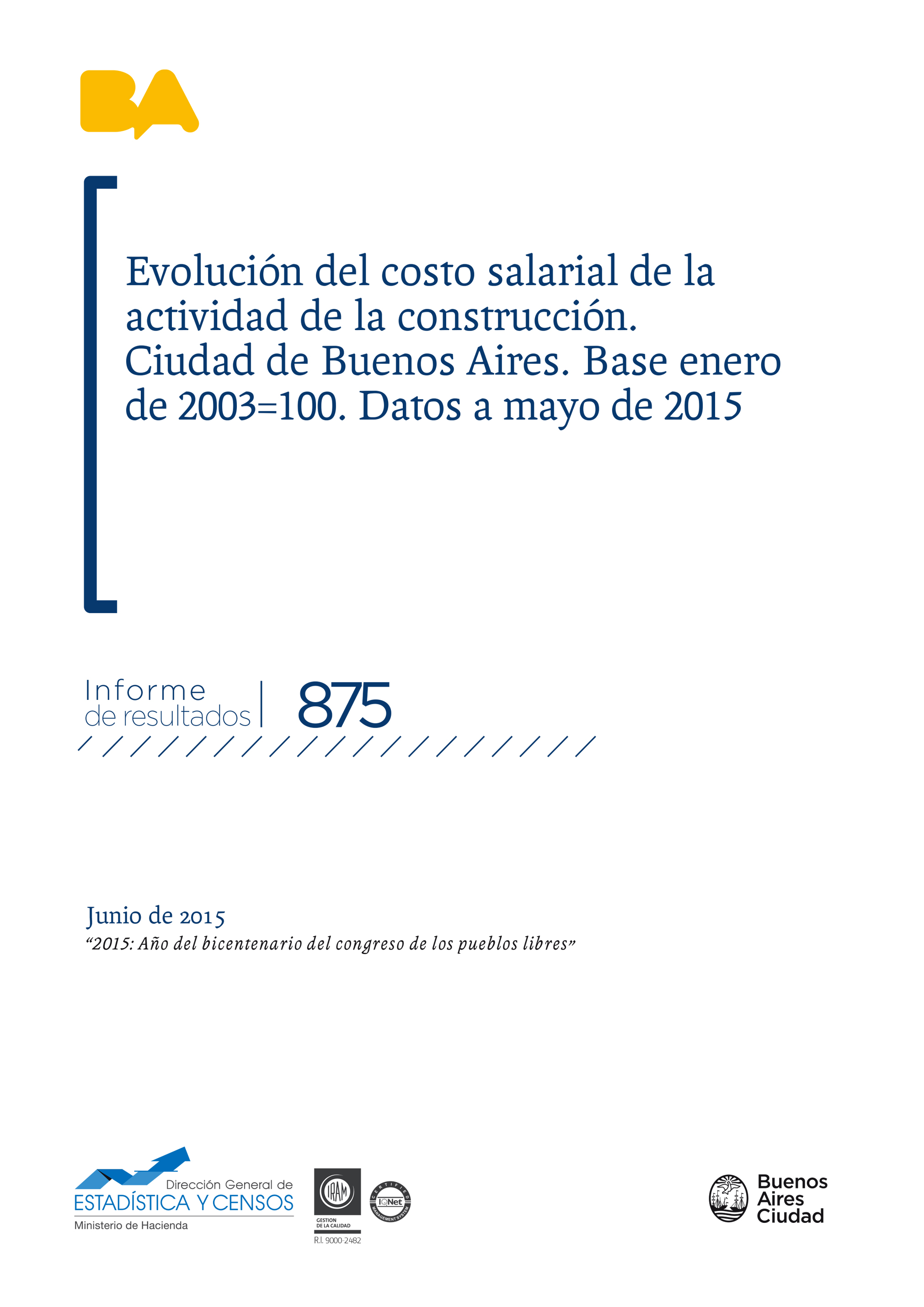 • Título: Evolución del costo salarial de la actividad de la construcción. Ciudad de Buenos Aires. Base enero de 2003=100. Datos a mayo de 2015