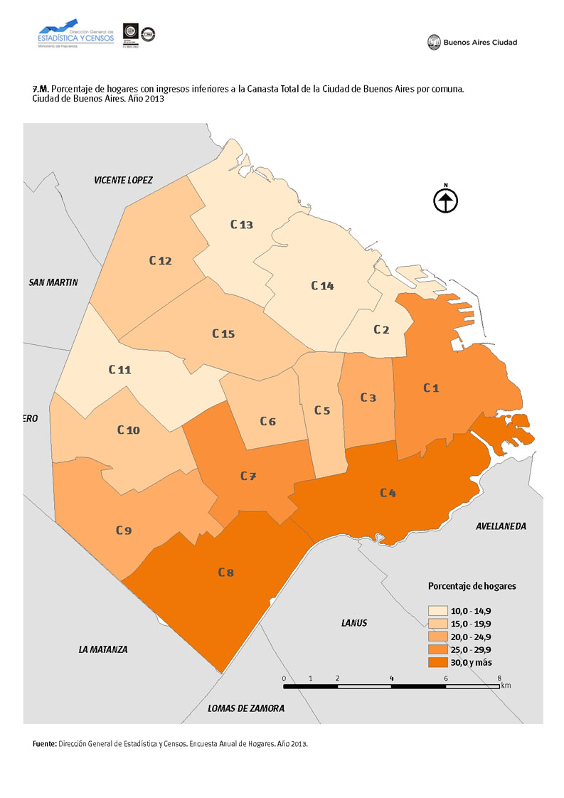 Porcentaje de hogares con ingresos inferiores a la Canasta Total de la Ciudad de Buenos Aires por comuna. Ciudad de Buenos Aires. Año 2013