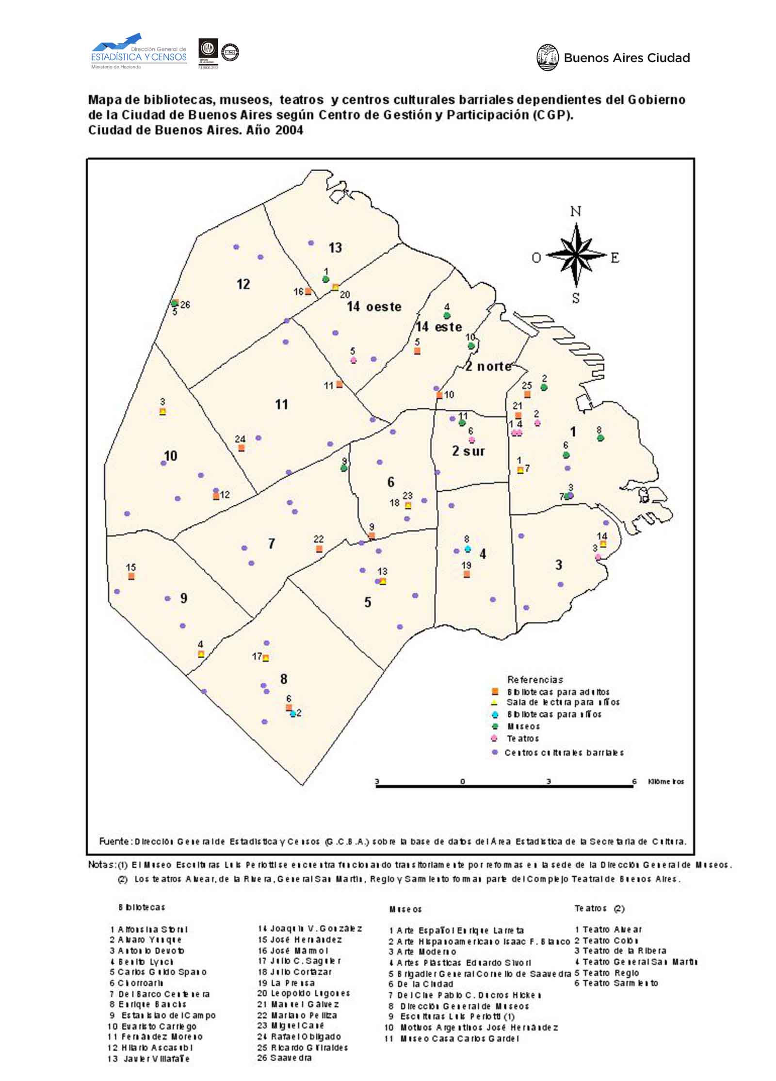 Mapa de bibliotecas, museos, teatros y centros culturales barriales dependientes del Gobierno de la Ciudad de Buenos Aires según Centro de Gestión y Participación (CGP) de la Ciudad de Buenos Aires. Año 2004