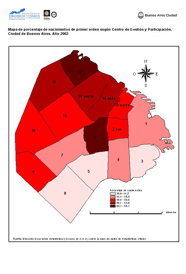 Mapa de porcentaje de nacimientos de primer orden según Centro de Gestión y Participación. Ciudad de Buenos Aires. Año 2002