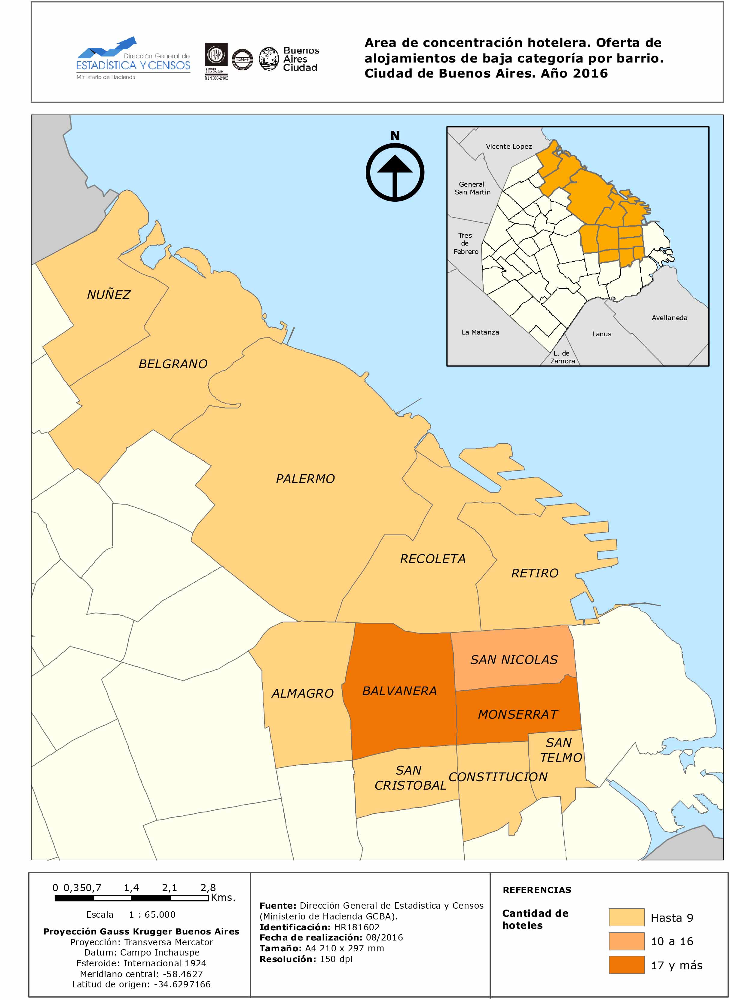Area de concentración hotelera. Oferta de alojamientos de baja categoría por barrio. Ciudad de Buenos Aires. Año 2016