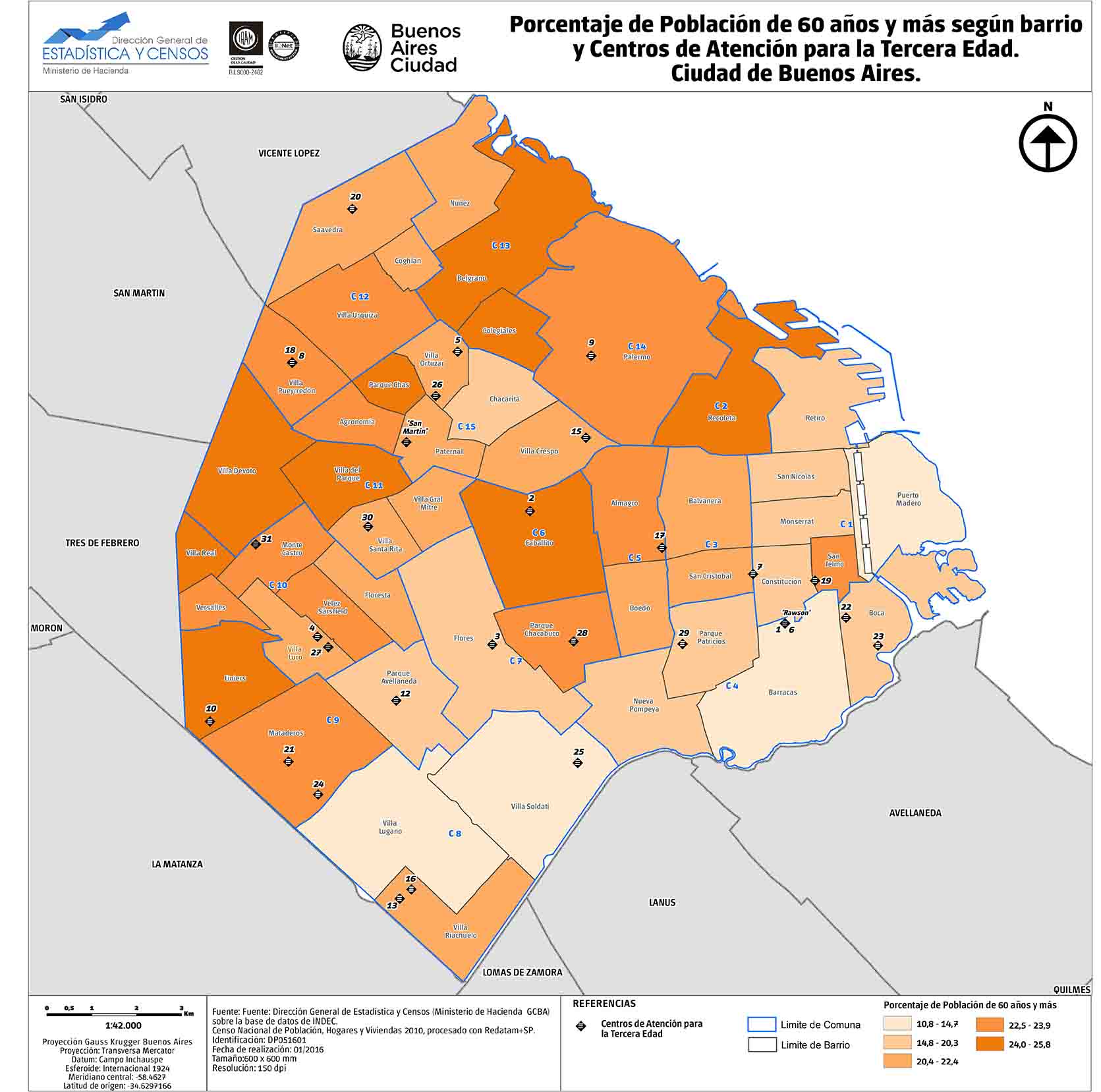 Porcentaje de población 60 años y más según barrio y Centros de Atención para la tercera edad. Ciudad de Buenos Aires. Año 2016