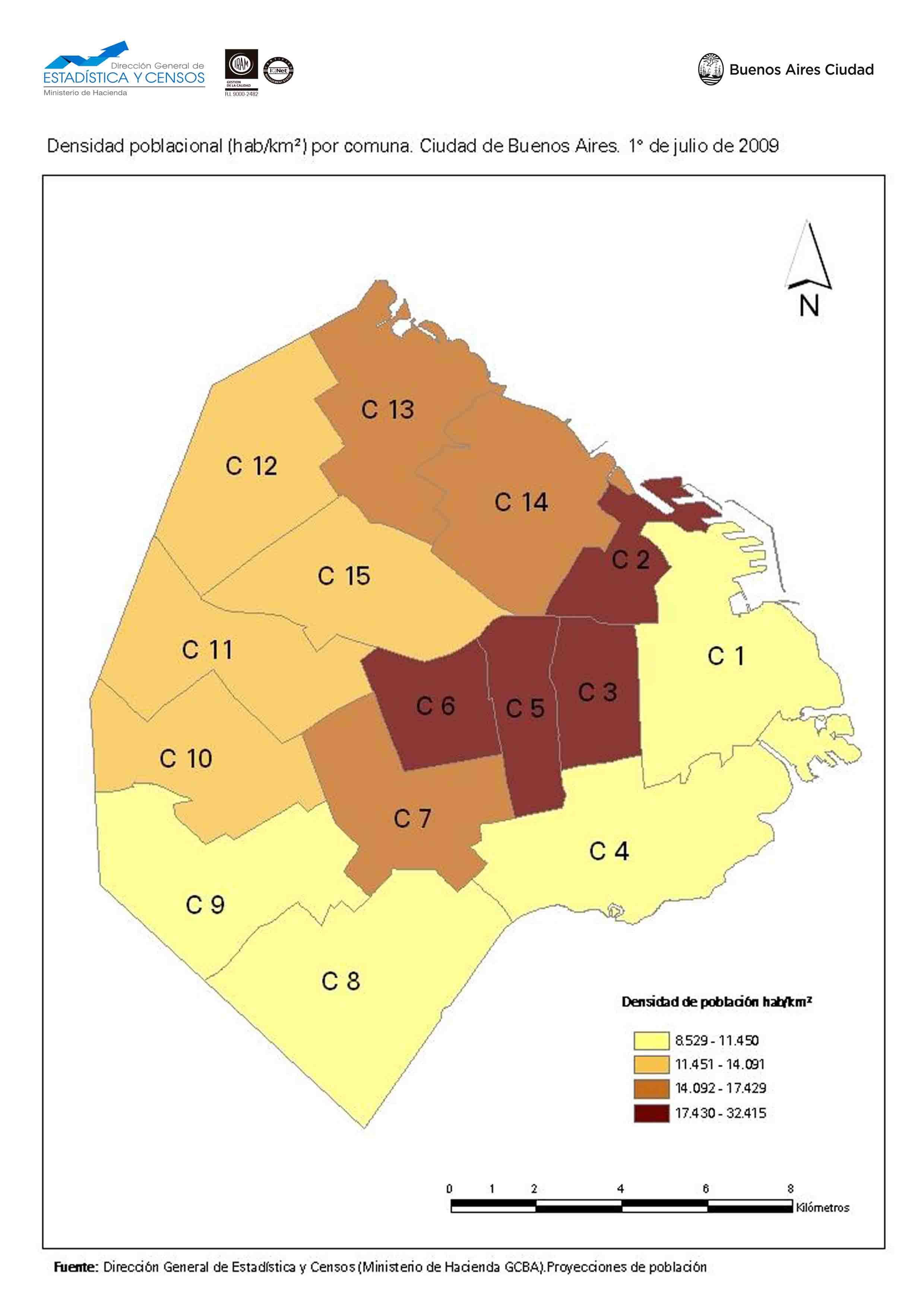 Densidad de población (hab/km2) según comuna. Ciudad de Buenos Aires. 1 ºjulio 2009