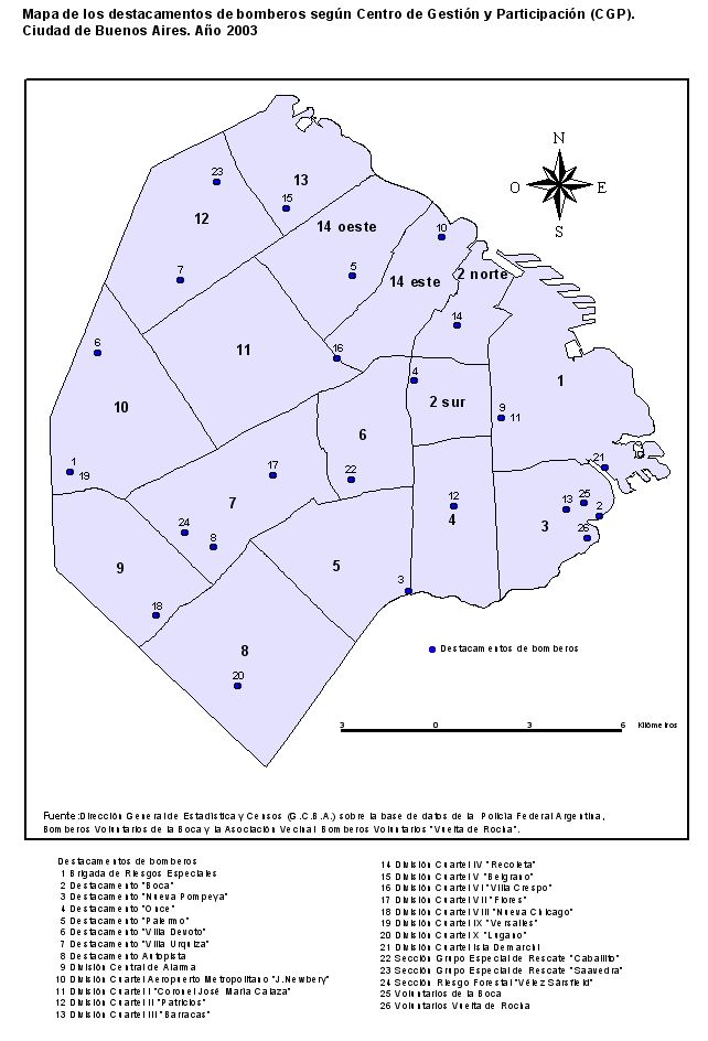 Mapa de los destacamentos de bomberos según Centro de Gestión y participación (CGP). Ciuadad de Buenos Aires. Año 2003