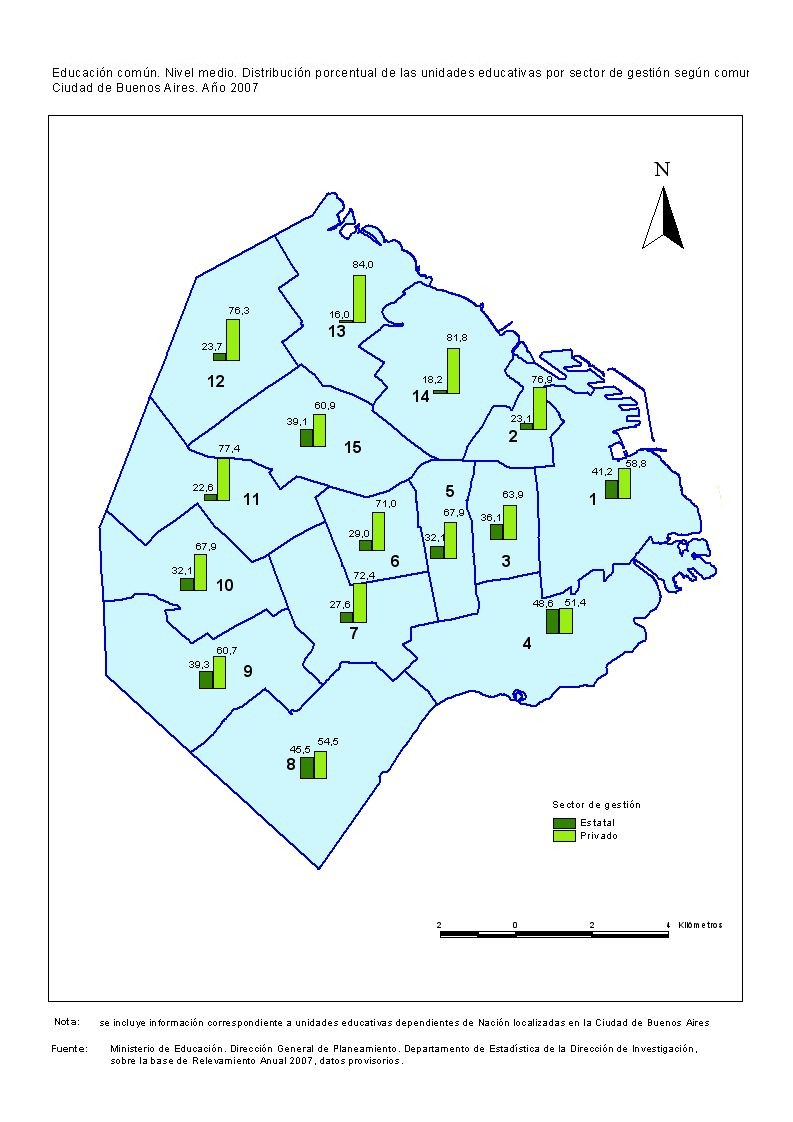 Educación común. Nivel medio. Distribución porcentual de las unidades educativas por sector de gestión según comuna. Ciudad de Buenos Aires. Año 2007