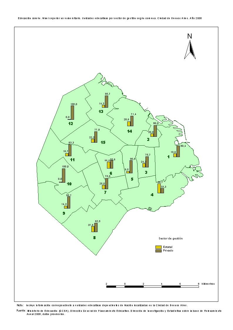Educación común. Nivel superior. Unidades educativas por sector de gestion según comuna. Ciudad de Buenos Aires. Año 2008
