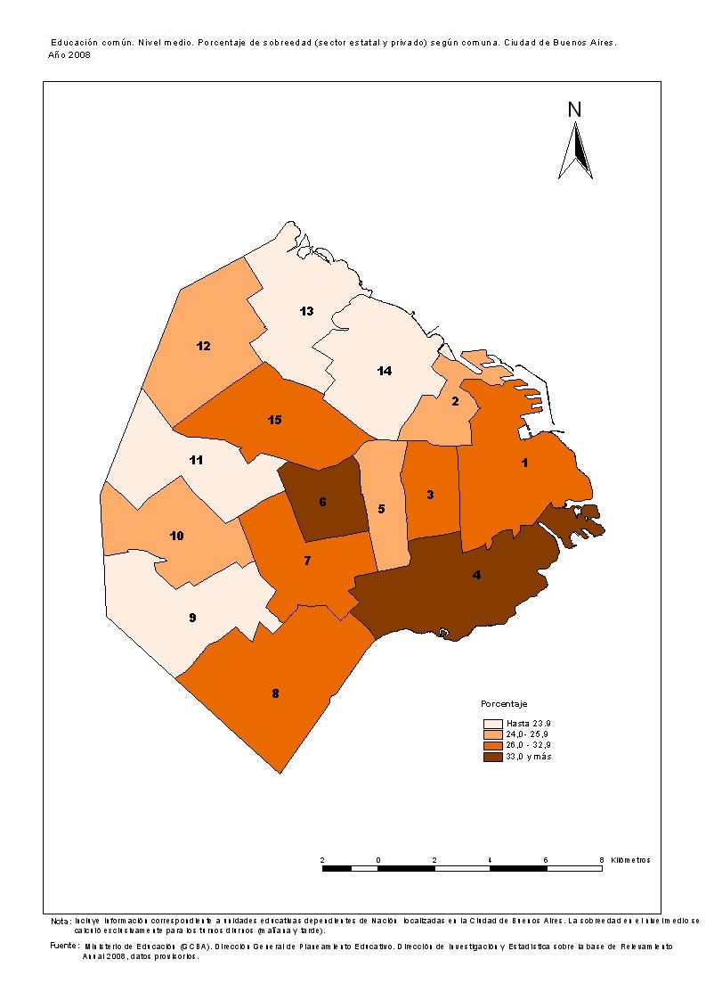 Educación común. Nivel medio. Porcentaje de sobreedad (sector estatal y privado) según comuna. Ciudad de Buenos Aires. Año 2008