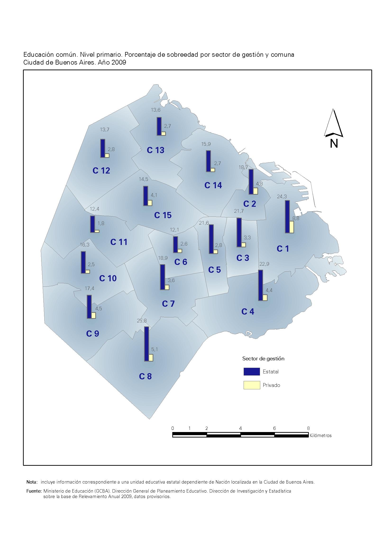 Educación común. Nivel primario. Porcentaje de sobreedad por sector de gestión según comuna. Ciudad de Buenos Aires. Año 2009