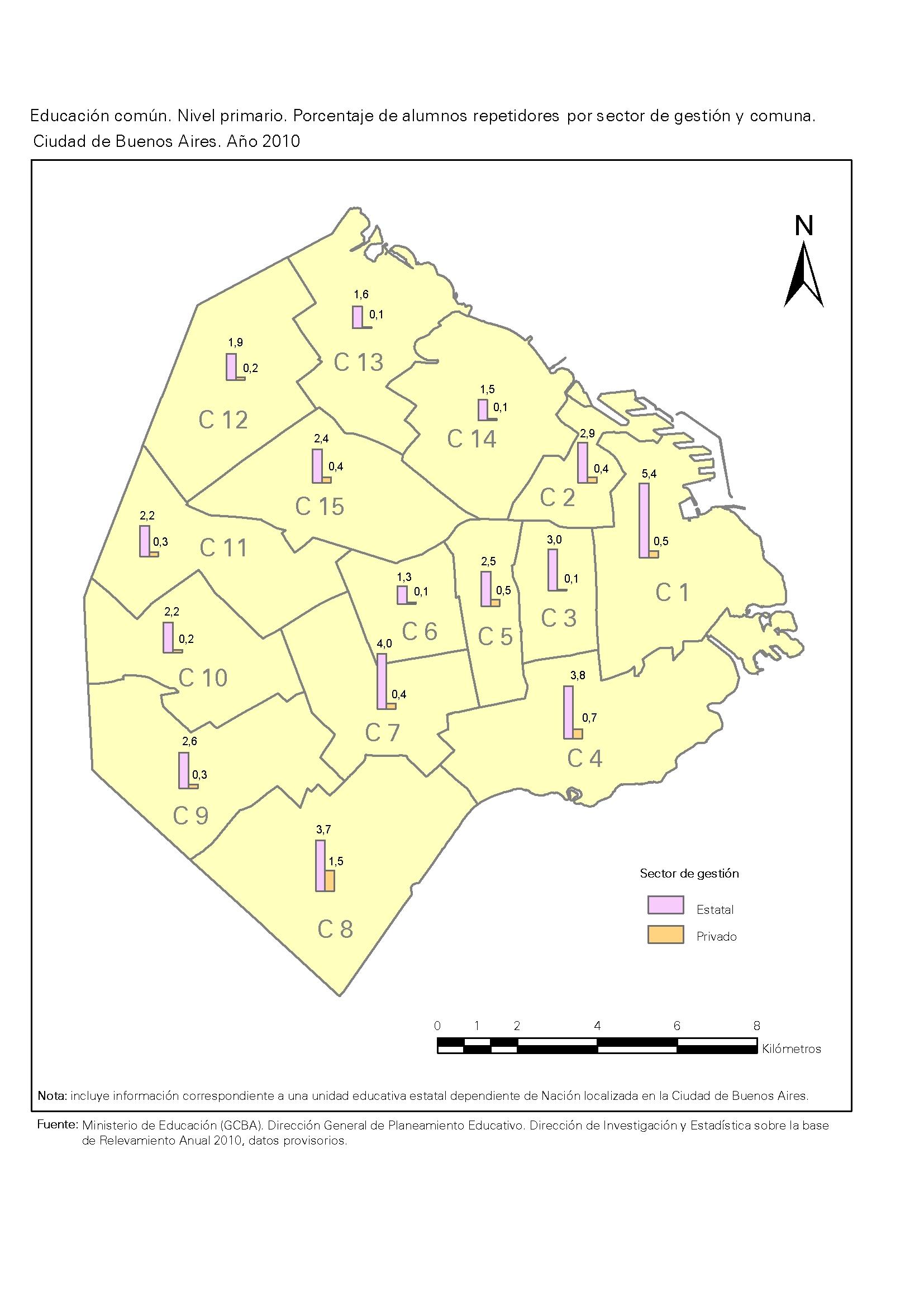 Educación común. Nivel primario. Porcentaje de alumnos repetidores por sector de gestión y comuna. Ciudad de Buenos Aires. Año 2010