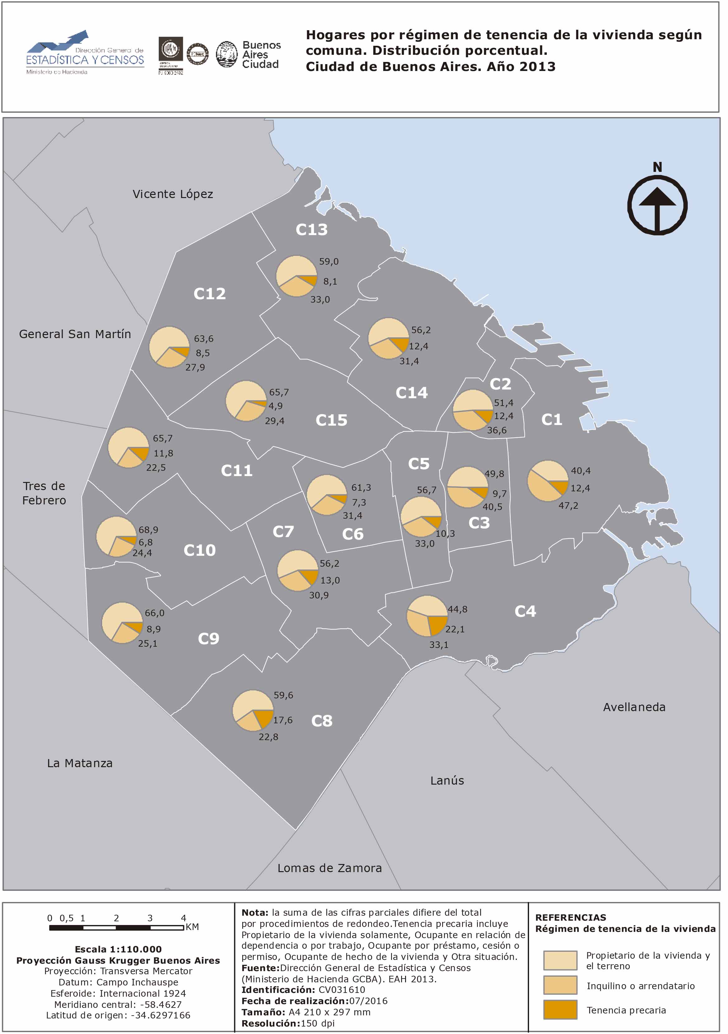 Hogares por régimen de tenencia de la vivienda según comuna. Distribución porcentual. Ciudad de Buenos Aires. Año 2013
