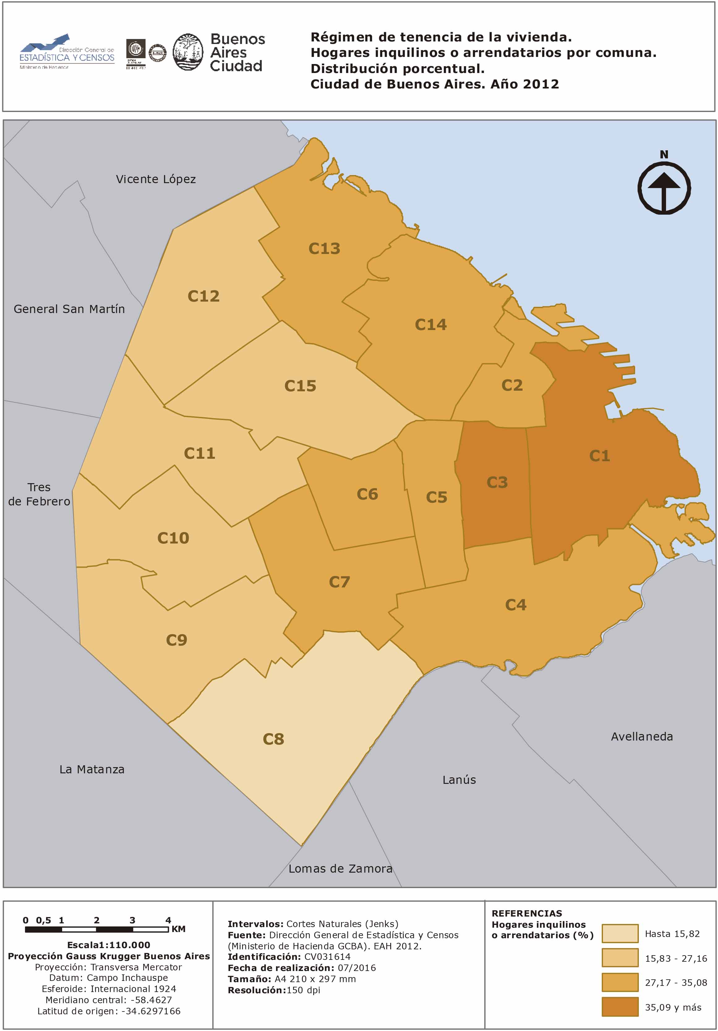 Régimen de tenencia de la vivienda. Hogares inquilinos o arrendatarios por comuna. Distribución porcentual. Ciudad de Buenos Aires. Año 2012