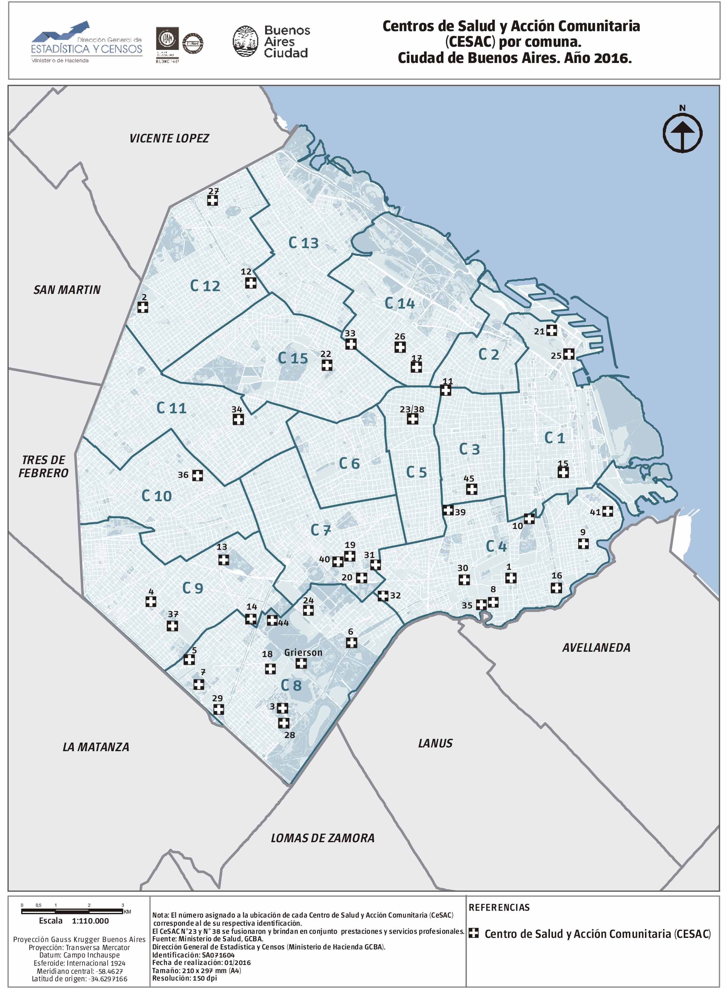 Centros de Salud y Acción Comunitaria (CESAC) por comuna. Ciudad de Buenos Aires. Año 2016.