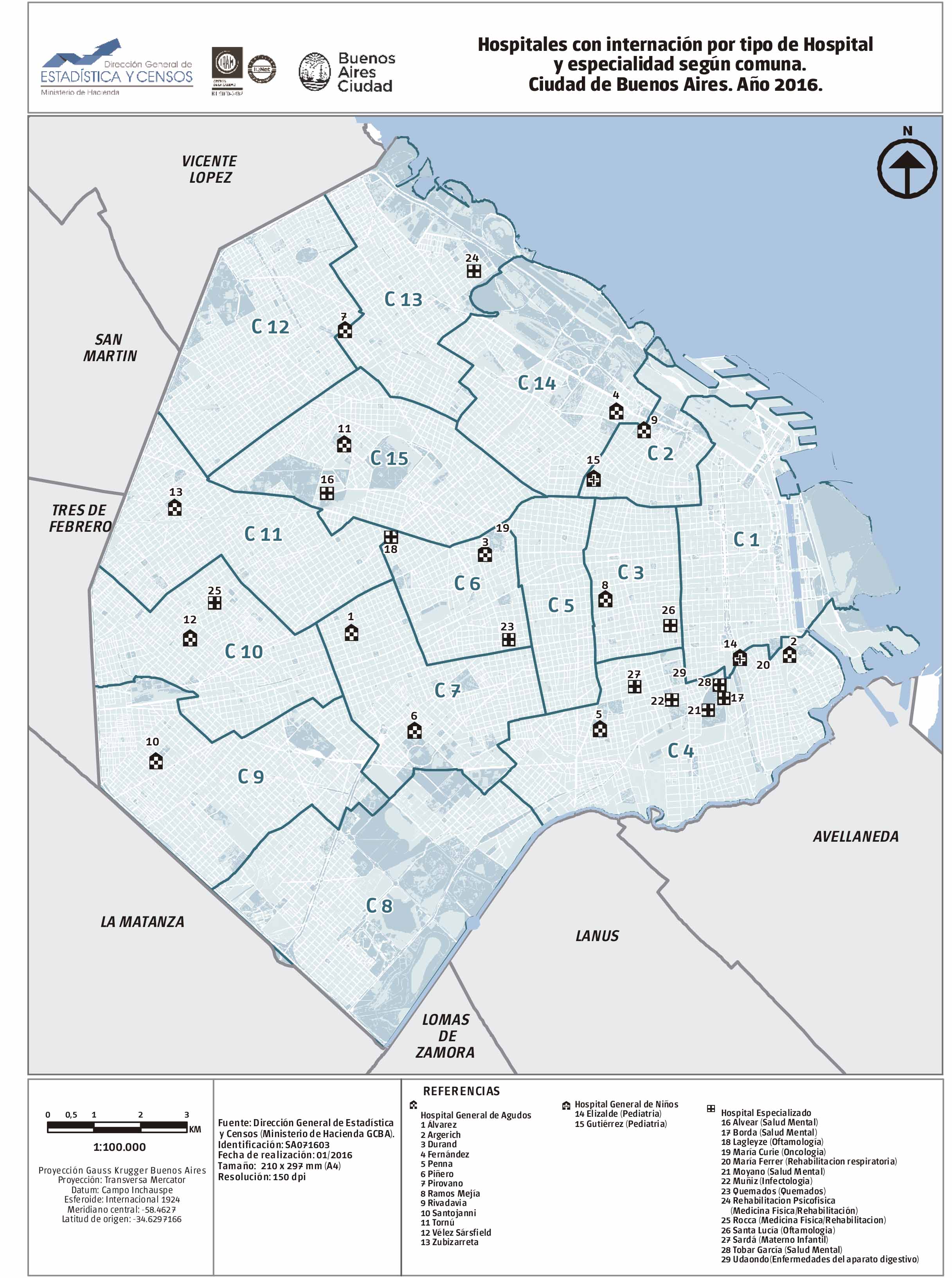 Hospitales con internación por tipo de hospital y especialidad según comuna. Ciudad de Buenos Aires. 2016