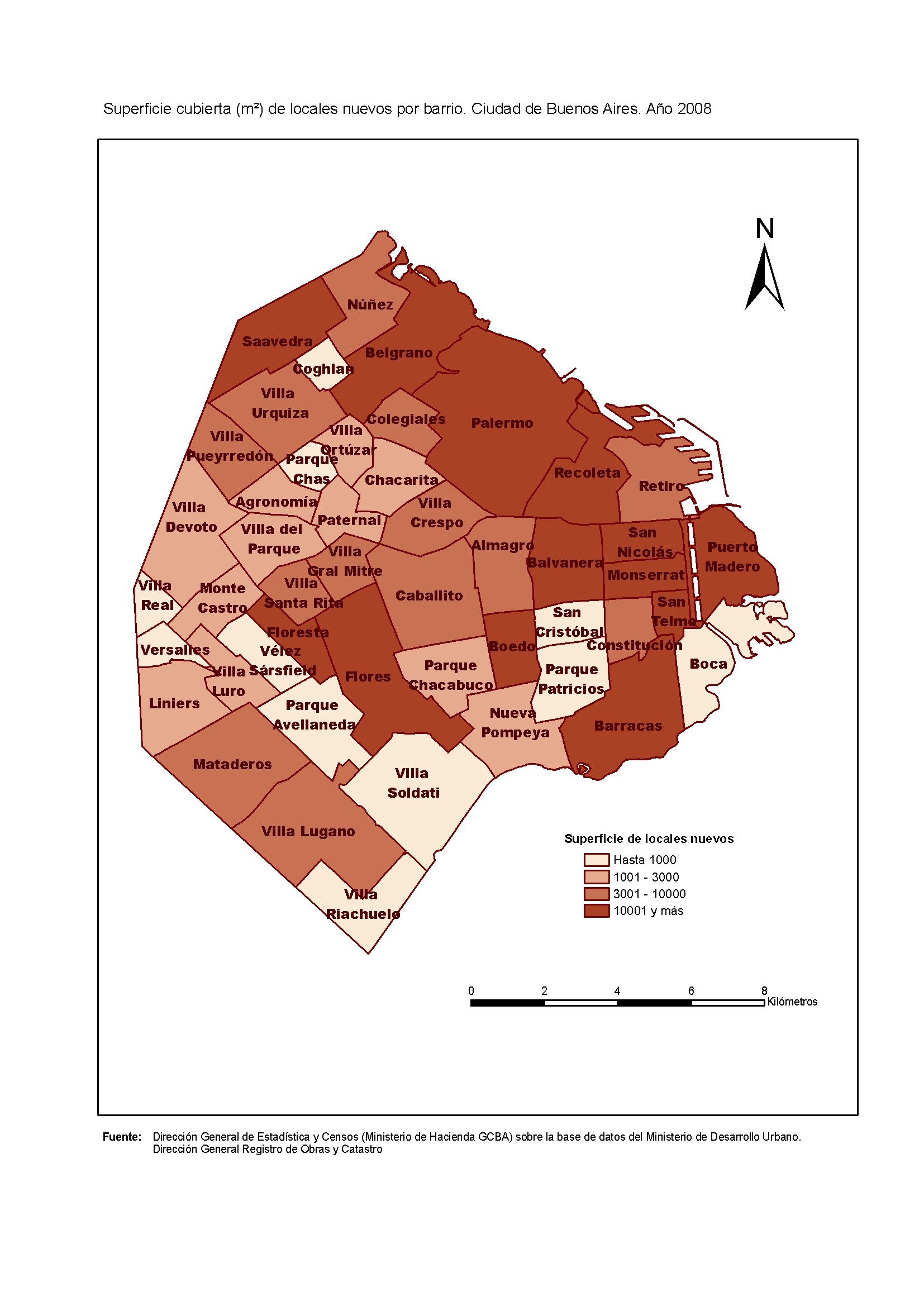 Superficie cubierta (m2) de locales nuevos por barrio. Ciudad de Buenos Aires. Año 2008