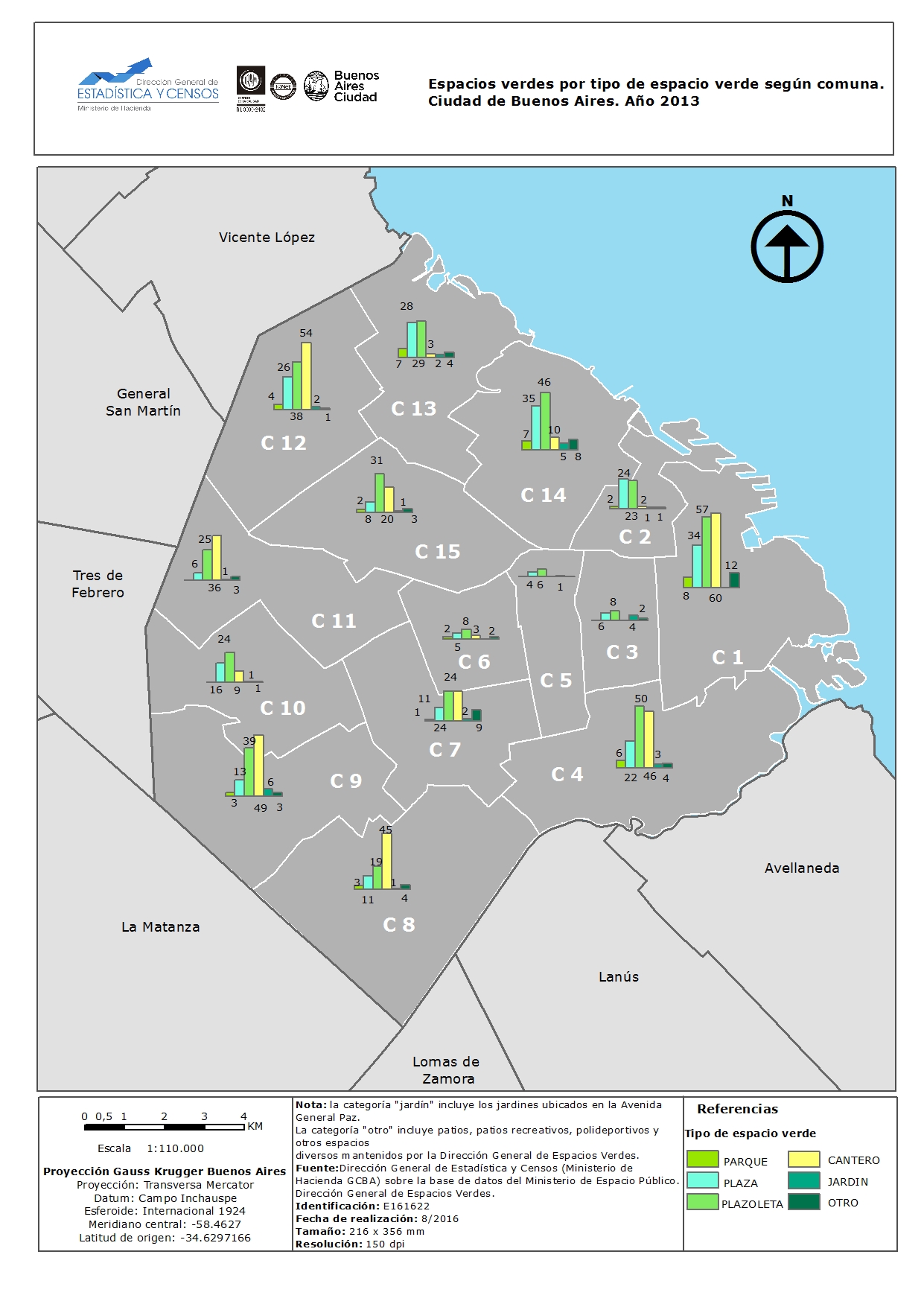 Espacios verdes por tipo de espacio verde según comuna. Ciudad de Buenos Aires. Año 2013