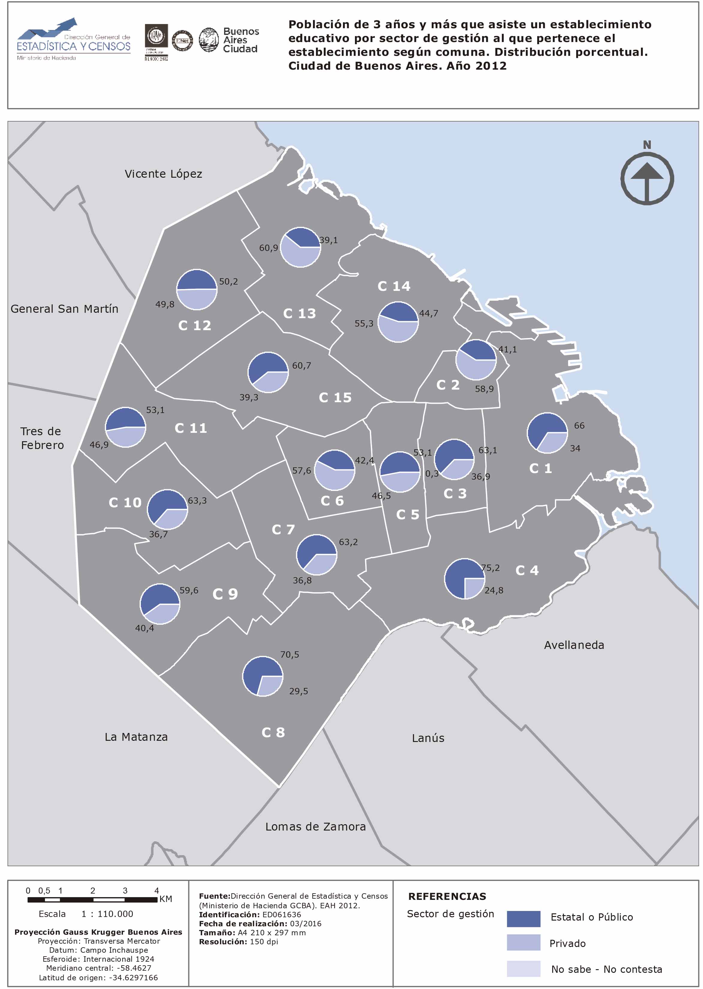 Población de 3 años y más que asiste a un establecimiento educativo por sector de gestión al que pertenece el establecimiento según comuna. Distribución porcentual. Ciudad de Buenos Aires. Año 2012