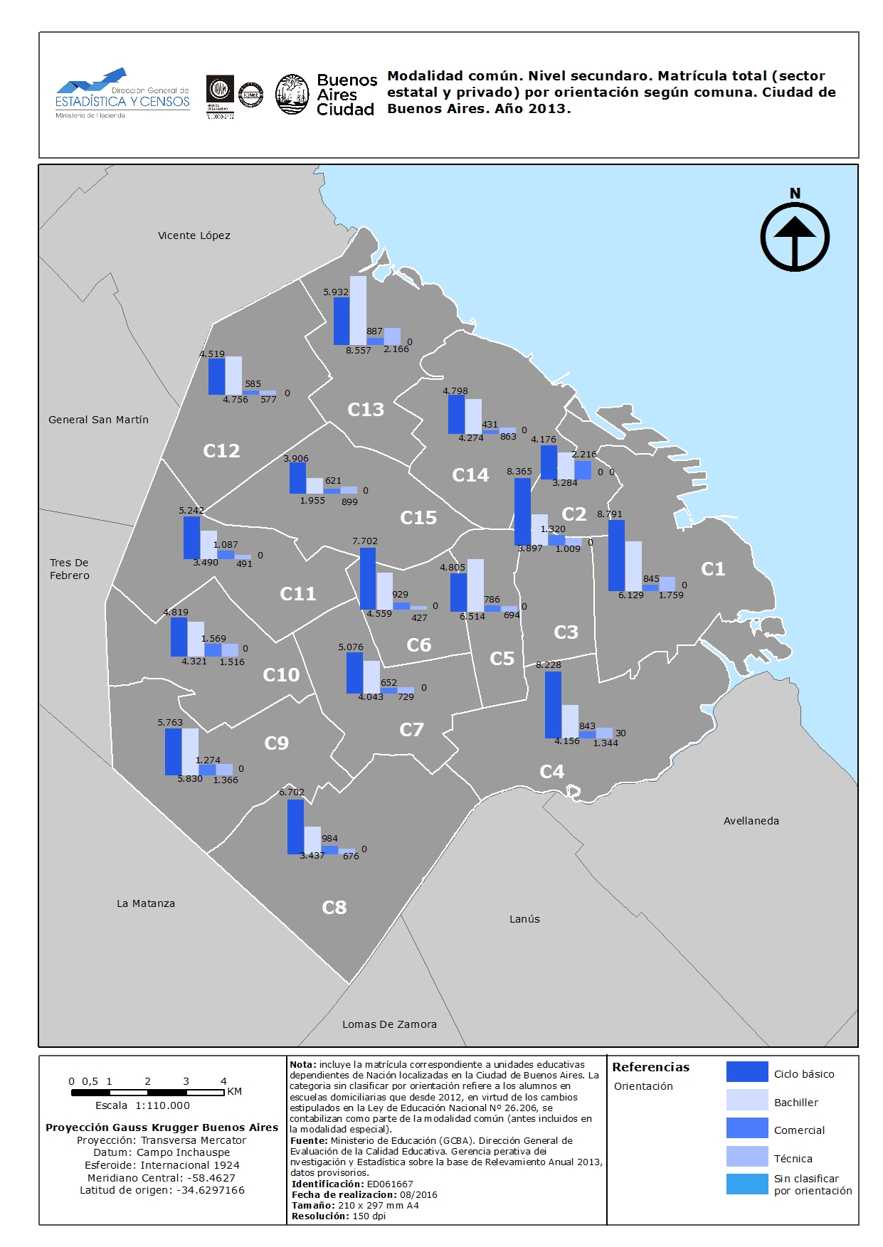 Modalidad común. Nivel secundario. Matrícula total (sector estatal y privado) por orientación según comuna. Ciudad de Buenos Aires. Año 2013.