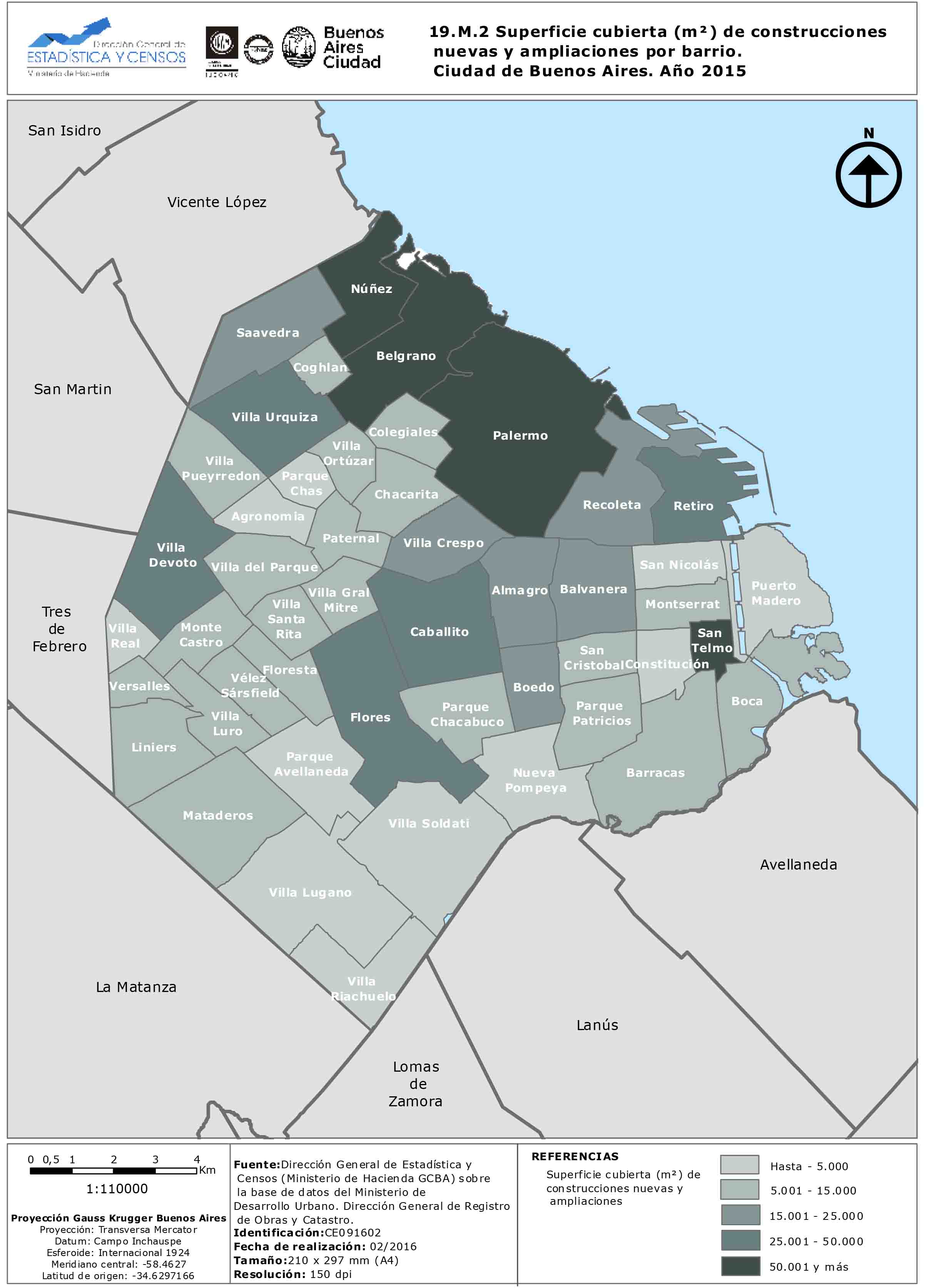 Superficie cubierta (m²) de construcciones nuevas y ampliaciones por barrio. Ciudad de Buenos Aires. Año 2015