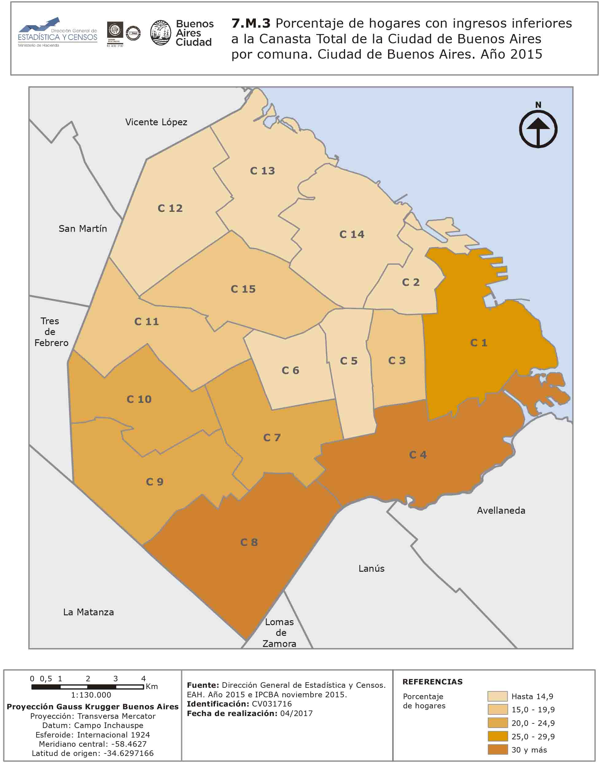 Pocentaje de hogares con ingresos inferiores a la Canasta Total de la Ciudad de Buenos Aires por comuna. Ciudad de Buenos Aires. Año 2015