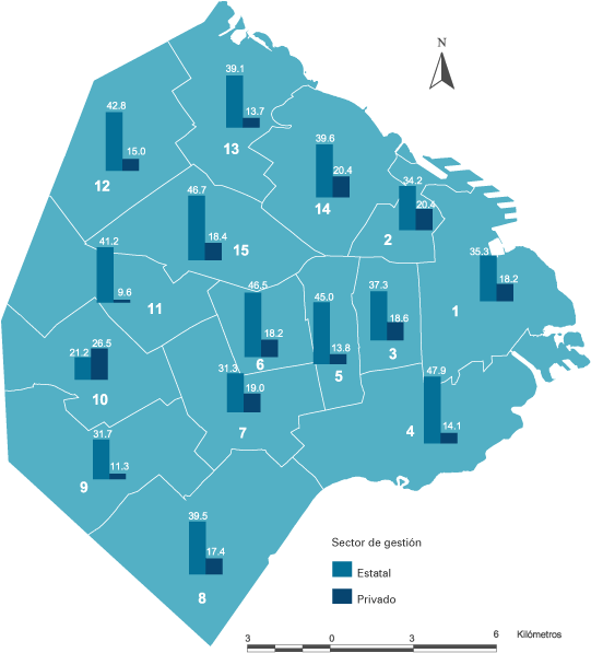 Porcentaje de sobreedad en el nivel medio, educación común, turnos diurnos, por sector de gestión según comuna. Ciudad de Buenos Aires. Año 2007