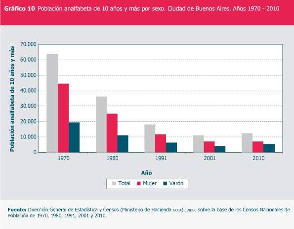 Población analfabeta de 10 años y más por sexo. Ciudad de Buenos Aires. Años 1970 - 2010