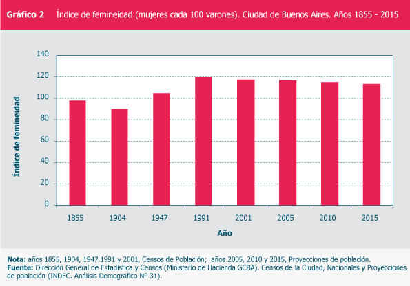 Índice de femineidad (mujeres por cada 100 varones). Ciudad de Buenos Aires. Años 1855 - 2015