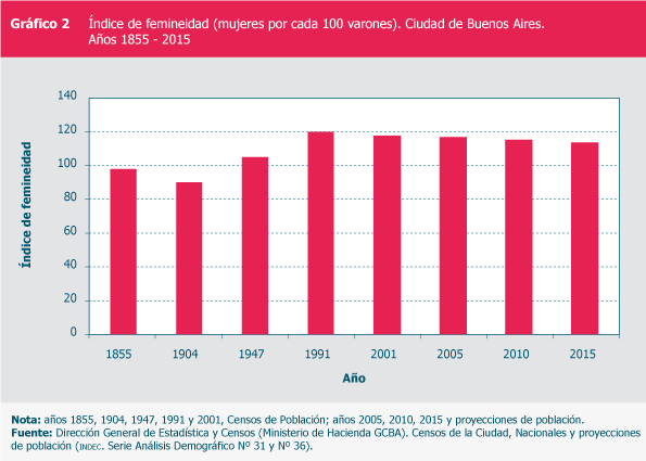 Índice de femineidad (mujeres por cada 100 varones). Ciudad de Buenos Aires. Años 1855 - 2015