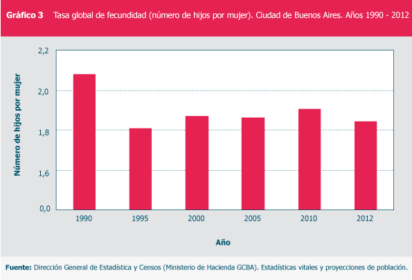 Tasa global de fecundidad (número de hijos por mujer). Ciudad de Buenos Aires. Años 1990 - 2012