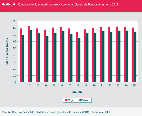 Edad promedio al morir por sexo y comuna. Ciudad de Buenos Aires. Año 2012